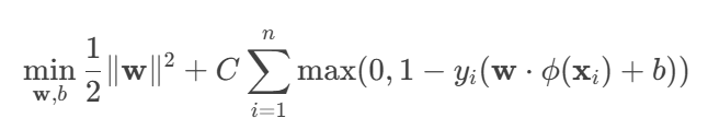 - max(0, 1 - yi(…)): hinge loss (penalty if a sample is misclassified or too close to the margin).